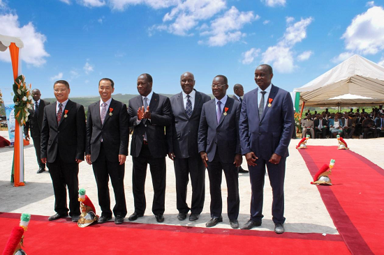 2015年3月2日,,,,阿比让供水一期项目完工仪式暨二期项目开工仪式上,,,,瓦塔拉总统和敦坎总理为中国地质科特迪瓦分公司认真人揭晓声誉勋章